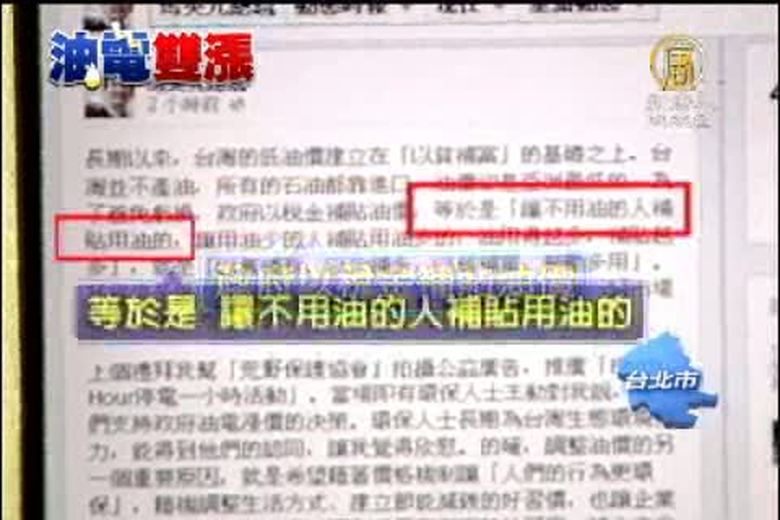 新聞一開始,先來關心,自從這個星期,馬政府一口氣調漲3元油價後,輿論批評聲浪不斷,馬總統6日晚間再次透過臉書回應,他說長期以來政府以稅金補貼油價,等於是讓不用油的人補貼用油的人,這是違反公平正義原則,因此油價的調漲就是要回歸市場機制。 //asset2.ntdtv.com.tw/public/uploads/video/2012/04/08/20120408-7768574.flv 油價上漲|漲價|中油|市場機制2012-04-07 21:03:18