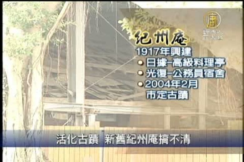 台北市活化古蹟,如今變成「新蓋古蹟」了嗎?台北市同安街的市定古蹟紀州庵,是日據時代相當著名的料理亭,但是市議員發現,市府把古蹟本尊用鐵皮圍著,然後在旁邊砸下近5000萬蓋了一棟新的古蹟,也叫「紀州庵」,讓不知情的民眾搞不清楚,批評市府活化古蹟顯得不倫不類。 //asset3.ntdtv.com.tw/public/uploads/video/2012/04/16/20120416-7924037.flv 紀州庵|古蹟|日據時期|台北市2012-04-15 21:16:26