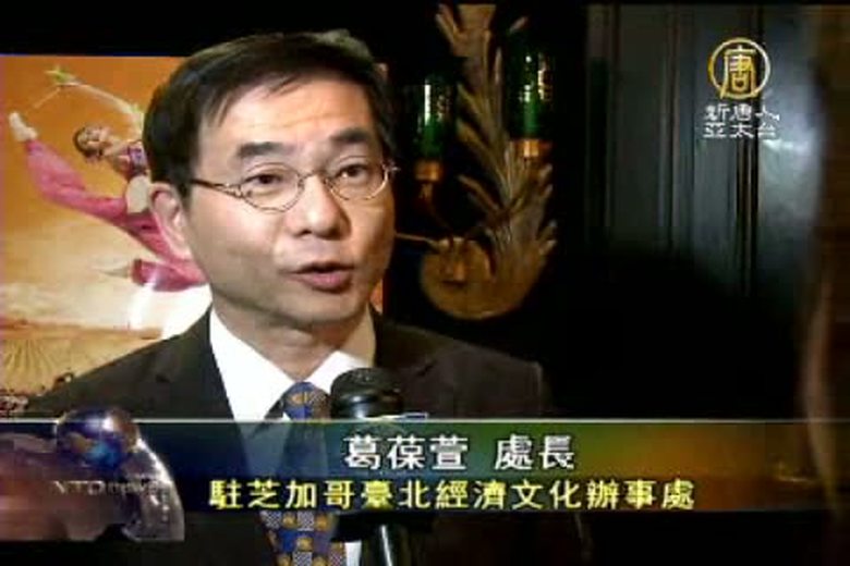 包括駐芝加哥臺北經濟文化辦事處處長葛葆萱、僑教中心主任陳永豐在內的我國駐芝官員共十人,日前(19日)觀看了在芝加哥歌劇院上演的神韻晚會首場演出。處長葛葆萱表示,這是他五年來第二次觀看神韻,印象深刻,而且神韻越演越好,讓他十分感動。 //asset3.ntdtv.com.tw/public/uploads/video/2012/04/22/20120422-8021422.flv 神韻|駐芝加哥臺北經濟文化辦事處|芝加哥2012-04-22 01:42:04