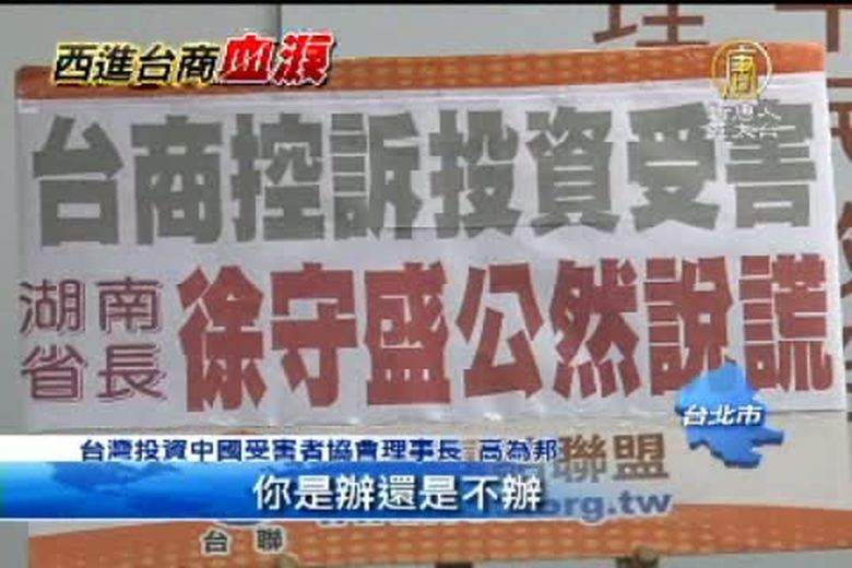 兩岸官方寄望在六月下旬簽署投保協議,近來也大力營造政商互動氛圍。湖南省長徐守盛率團400人來台,聲稱「有投資問題可以直接向他投訴」,對此,受害台商今天表示,湖南坑害案例十六年來討不回公道,昨天他們的場外抗議活動與媒體報導都受到壓制,台商批評,這又是個誘騙投資、傷台灣民主的統戰團。 //asset2.ntdtv.com.tw/public/uploads/video/2012/06/14/20120614-8918706.mp4 徐守盛|湖南省長|台商|投保協議|新聞自由2012-06-13 21:20:46