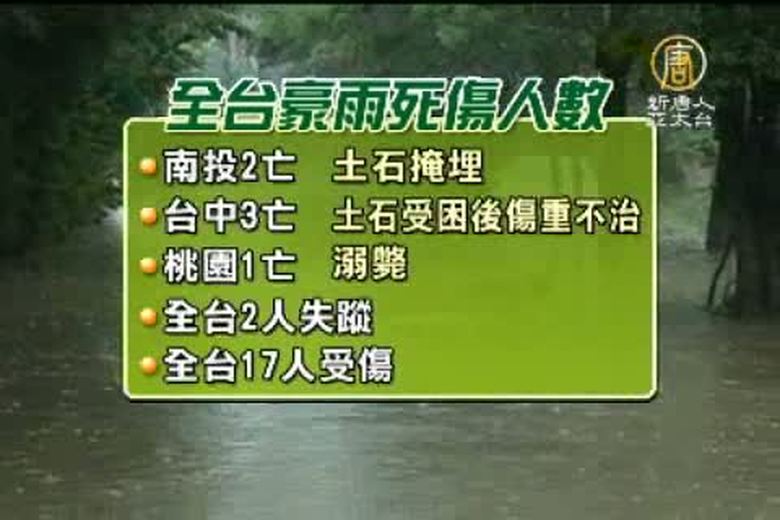 今天各地 雨勢明顯趨緩轉,不過卻傳出新的傷亡災情,今天(13日)上午在奧萬大聯外道路7.5公里處,有1位林務局南投林區管理處徐姓巡山員跌落山谷失蹤,目前還在搜救中。中央災害應變中心表示,統計全台因豪雨造成死傷人數,至下午4點為止,共有6人死亡、2人失蹤、17人受傷;而連日來的豪雨災害,造成農損嚴重,農委會統計,全台農損金額達2億7百74萬元,受損地區以桃園縣損失8566萬元較多,其次為南投縣3933萬元、高雄市1907萬元、屏東縣1763萬元、嘉義縣1205萬元及雲林縣1178萬元。農委會也已經啟動 //asset1.ntdtv.com.tw/public/uploads/video/2012/06/14/20120614-8923237.mp4 2012-06-13 21:04:40