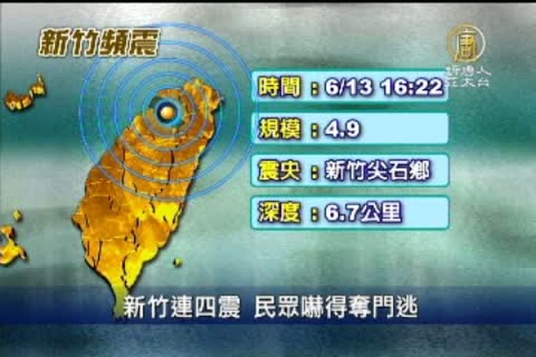 新竹從昨天傍晚4點22分發生規模4.9的有感地震後,包括尖石和關西又接連發生三起有感地震,這四起地震都屬於淺層地震,也因此搖晃程度,新竹民眾感受特別強烈,氣象局表示,發生群震的新竹這一帶屬於盲斷層、斷層短,引起的後續地震規模應該不會太大。 //asset3.ntdtv.com.tw/public/uploads/video/2012/06/15/20120615-8938540.mp4 地震|尖石|關西|氣象局|新竹2012-06-14 21:07:01