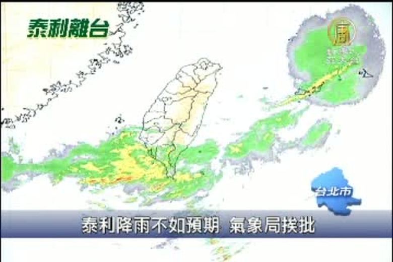 泰利颱風以暴衝的速度穿越台灣海峽,海陸警報已經全面解除,而且也減弱為熱帶性低氣壓,由於氣象局原本預估中南部會降下1500毫米的超大豪雨,但20日晚間下修到800毫米到1200毫米,被質疑預報差很大,但氣象局解釋,因為泰利速度快,沒有滯留,因此降雨不明顯。 //asset2.ntdtv.com.tw/public/uploads/video/2012/06/22/20120622-9063657.mp4 泰利|颱風|警報|氣象局|降雨2012-06-21 21:05:21