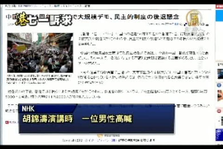 香港七一抗議活動引發矚目,相較於中國大陸媒體的閃避低調,台、港、日媒都加以報導,議論香港主權移交15年的貧富懸殊與政治遭干預的環境,香港媒體還特別提到這次前線採訪受限制的情況。 //asset3.ntdtv.com.tw/public/uploads/video/2012/07/03/20120703-9241105.mp4 七一|香港|媒體|抗議|胡錦濤2012-07-02 21:31:34