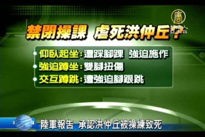 接著帶您關心,洪仲丘枉死案,陸軍行政調查報告曝光,承認洪仲丘在禁閉室被操練過當致死,不過,對是誰從中惡整,動機又是為何,通通看不到。因此遭立委批評認為是一份有事實,沒真相的報告。根據陸軍調查報告內容,洪仲丘生前在禁閉室,在體力瀕臨透支情況下,仍遭踩住右腳踝,強迫坐仰臥起坐,洪仲丘明明已經反應,右腳疼痛,仍被強迫蹲坐導致雙腳扭傷,在7月3日身亡當天下午,洪仲丘就被強迫做伏地挺身82下,平躺抬腿、交互蹲跳近40下,跑30 公尺操場40圈,開合跳110下和仰臥起坐50下,陸軍承認操課確實過當,但惡整動機,軍方沒 //asset1.ntdtv.com.tw/public/uploads/video/2013/07/23/20130723-15810314.mp4 台灣要聞|洪仲丘|調查報告|操課|過當|陸軍2013-07-23 00:47:30