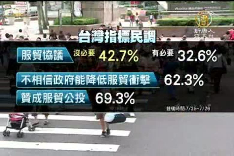 立法院將在明天(週四)審查兩岸服務貿易協議,然而學界與業界的疑慮仍然高漲,有機構做民調指出,六成二民眾不相信政府能夠降低服貿協議衝擊;近七成民眾贊成以公投決定是否簽署服貿協議。對此,陸委會主委王郁琦今天只回應,尊重相關意見,一切按照審查程序進行 。 //asset1.ntdtv.com.tw/public/uploads/video/2013/08/01/20130801-15996793.mp4 台灣要聞|服貿協議|王郁琦|反媒體壟斷|蔡培慧2013-07-31 21:32:30