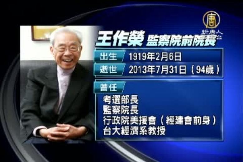 前監察院長王作榮今天(31日)上午因肺炎引發併發症敗血性休克,病逝台北榮總,享壽95歲。王作榮最為人熟知的官銜是考選部長、監察院長,不過,他更早曾服務過行政院美援會,及台大經濟系教授。不管在朝在野,王作榮秉持經濟專業及對社會的使命感,在媒體針砭時事、提出國是建言,被喻為是「台灣第1位政策經濟學家」。王作榮病逝,馬英九總統透過總統府發言人表示,不捨與遺憾,並指示政府相關單位全力協助家屬處理後事。 //asset3.ntdtv.com.tw/public/uploads/video/2013/08/01/20130801-15996794.mp4 台灣要聞|王作榮2013-07-31 21:12:02
