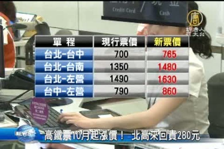 高鐵票要漲價了!台灣高鐵公司今天表示,最快10月1日起,平均票價將調漲9.69%,台北到高雄來回會增加280元,反應營運成本增加。 //asset2.ntdtv.com.tw/public/uploads/video/2013/08/08/20130808-16182368.mp4 消費流行|高鐵|票價|漲價|交通部|優惠2013-08-07 21:46:21