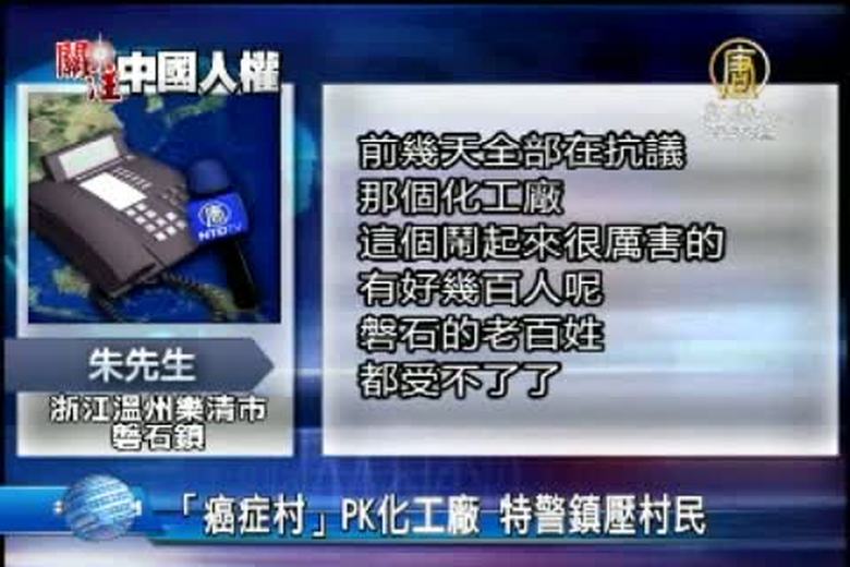 浙江溫州樂清市上千名村民3號到一家化工廠前抗議,原因是工廠長期排放的毒氣和污水,導致村民罹患癌症,但卻遭到了當局派出的數百名員警鎮壓,多名村民被抓,數十人受傷。村民到市政府請願,要求放人,不過,村民表示,當局沒有對此做出任何答覆。 //asset1.ntdtv.com.tw/public/uploads/video/2013/08/08/20130808-16180377.mp4 真相中國|癌症村|抗議|汙染|樂清市|浙江2013-08-07 21:24:50