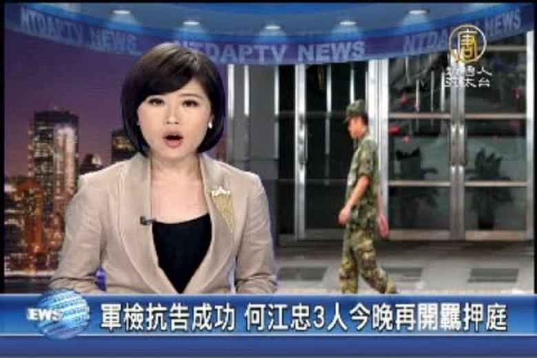 陸軍洪仲丘案,原本在押的被告542旅副旅長何江忠、連長徐信正、上士范佐憲,日前裁定交保,軍檢署不服提出抗告,最高軍事法院今天(7號)中午裁定發回重審,軍檢抗告成功,高等軍事法院在今晚7點重開羈押庭。 //asset2.ntdtv.com.tw/public/uploads/video/2013/08/08/20130808-16182333.mp4 台灣要聞|洪仲丘|交保|抗告|羈押2013-08-07 21:15:43