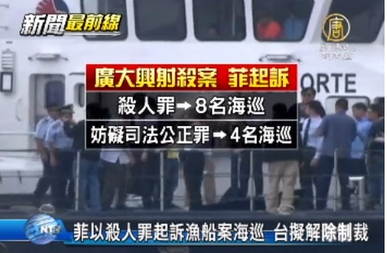 菲律賓國家調查局今天公布84頁的調查報告,建議以「殺人罪」起訴「廣大興28號」涉案的8名海岸防衛隊員。菲律賓調查局長羅亞斯指出,當時MCS 3001巡邏艦上的12人當中,共有8名海岸防衛隊員(PCG)向台灣漁船開槍,造成漁民洪石成中彈身亡。羅亞斯表示,菲國海岸防衛隊無法證明台灣漁船蓄意衝撞巡邏艦,手無寸鐵的台灣漁民也並未對防衛隊員造成生命威脅,建議以「殺人罪」起訴開槍的8名人員,另外4名海岸防衛隊員,則是被控竄改和刪減影片,涉及偽證和湮滅證據,建議以妨礙司法起訴。 //asset1.ntdtv.com.tw/public/uploads/video/2013/08/08/20130808-16180406.mp4 國際聚焦|廣大興28號|案菲律賓|起訴|殺人罪2013-08-07 21:11:03