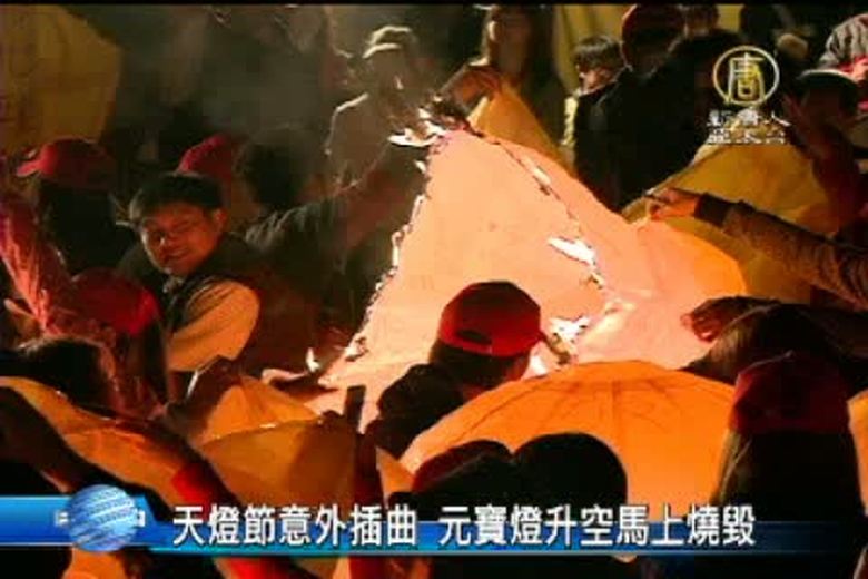 昨天(3日)晚上天燈節,大元寶主天燈升空不久,隨即卡在樹上燒毀,引起現場民眾驚呼,好在消防人員把火撲滅,沒有影響活動進行。雖然發生意外插曲,也有人說馬年馬上燒毀,象徵馬年越燒越旺。 //asset3.ntdtv.com.tw/public/uploads/video/2014/02/05/20140205-19527674.mp4 台灣寫真|天燈|平溪|元寶天燈|胡民樹2014-02-04 21:54:42