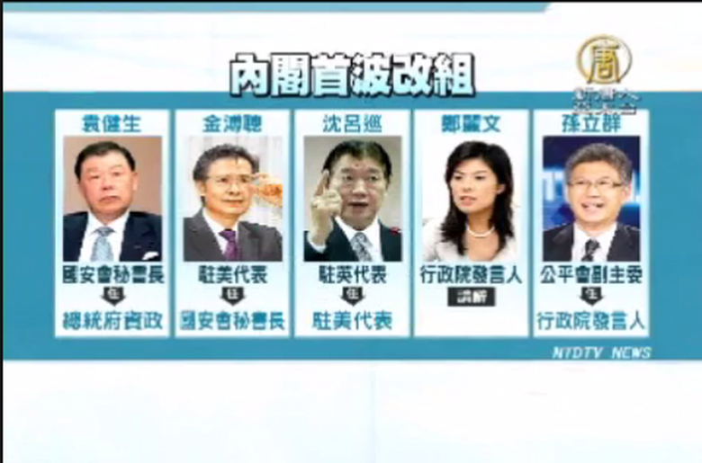 新聞首先來看到,總統府今天宣布,駐美代表金溥聰確定接任國安會秘書長,隨後行政院也公布第一波內閣改組名單,行政院發言人鄭麗文請辭獲准,由原公平會副主委孫立群接任。 //asset1.ntdtv.com.tw/public/uploads/video/2014/02/08/20140208-19576834.mp4 台灣要聞|內閣改組|金溥聰|鄭麗文|國安會2014-02-07 21:02:29