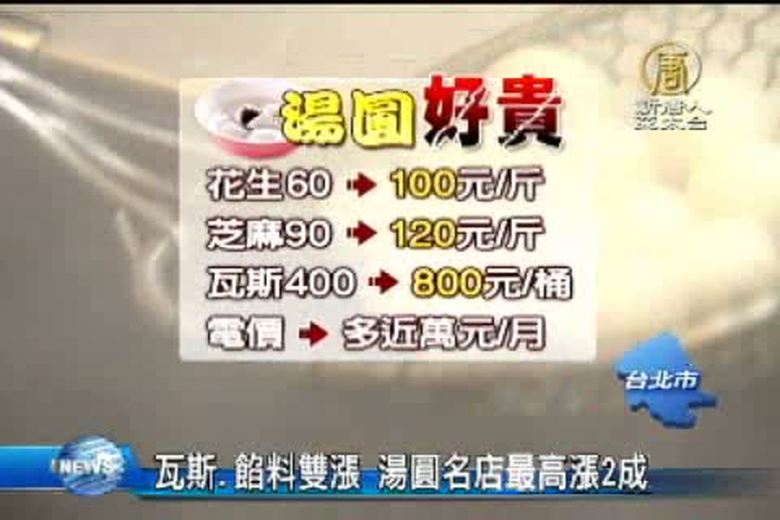 再過幾天就是元宵節,民眾想吃湯圓應景可要有心理準備了,因為受到原物料、瓦斯和電價上漲影響,台北市許多老字號賣元宵的店家,已經受不了成本的壓力,紛紛調漲價格5到10元。 //asset2.ntdtv.com.tw/public/uploads/video/2014/02/09/20140209-19592311.mp4 財經縱橫|漲價|物價|元宵|瓦斯|電價2014-02-08 21:39:05