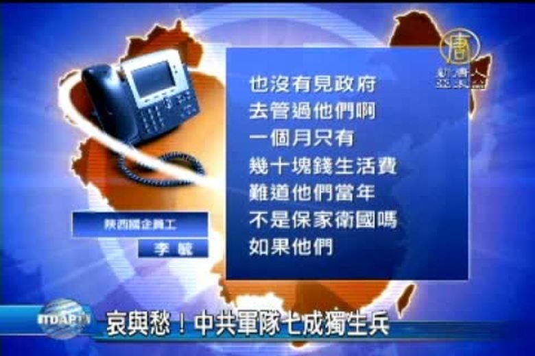 中共「一胎化」政策,造成當前軍隊中有70%的士兵是獨生子。一旦爆發戰爭,獨生子女戰死沙場,失去唯一孩子的年邁父母將晚景淒涼。大陸一名軍人母親向本台記者痛訴,自己的企業被強拆,他和當兵的兒子都被打傷,她問責中共政權,誰可以來保護他們﹖我們的獨家報導。 //asset1.ntdtv.com.tw/public/uploads/video/2014/02/09/20140209-19592319.mp4 真相中國|一胎化|養兒防老|獨生子|軍隊|戰鬥|軍事|作戰2014-02-08 21:24:48