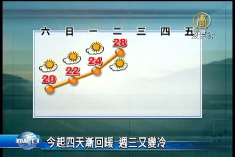 下了一個星期的雨終於放晴,氣象局表示,強烈冷氣團從今天白天開始減弱,所以未來4天溫度將一路回升至20度以上,下週二高溫更上看28度,只不過週三強烈大陸冷團再度南下,到時北部開始降雨,溫度降到17度以下,又會回到先前濕冷天氣的天氣型態。 //asset1.ntdtv.com.tw/public/uploads/video/2014/02/16/20140216-19714921.mp4 天氣預報|強烈冷氣團|下雨|低溫|台北2014-02-15 21:03:14