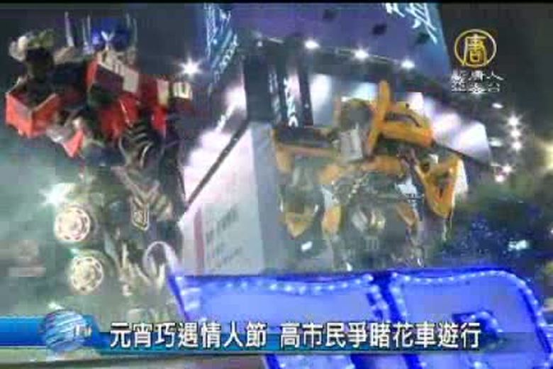 慶祝元宵節,高雄市14日夜間舉辦愛幸福花車大遊行,12部各式花車和20多個表演團體,從中華五福圓環出發,沿著五福路前進愛河,民眾夾道圍觀歡呼,熱鬧程度就像是一場嘉年華會。 //asset2.ntdtv.com.tw/public/uploads/video/2014/02/17/20140217-19737047.mp4 觀光旅遊|陳菊|元宵節|花車遊行|天國樂團|高雄2014-02-16 21:46:22