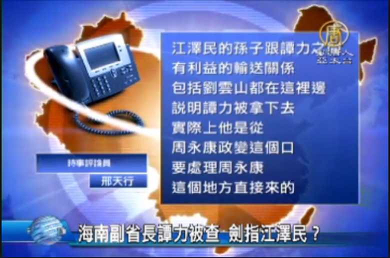 7月8號,海南省委常委、副省長譚力被通報,正接受組織調查,成為冀文林之後,第二位落馬的海南省省部級高官,究竟,這位「譚笑笑」的背景為何?落馬對周永康和江澤民將會有甚麼衝擊,請看我們的分析報導。 //asset1.ntdtv.com.tw/public/uploads/video/2014/07/11/20140711-24956602.mp4 真相中國|迫害|譚力|江澤民|周永康|政變|貪腐|習近平|最新消息2014-07-10 23:29:37