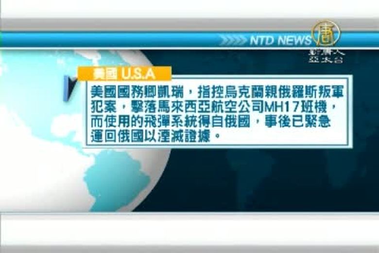 馬航MH17在烏克蘭東部遭親俄叛亂分子用飛彈擊落。美國國務卿凱瑞周日表示,證據顯示,馬航班機是被俄羅斯提供的導彈擊中的。西方國家譴責俄羅斯,要普亭必須對烏克蘭東部動盪負責。 //asset2.ntdtv.com.tw/public/uploads/video/2014/07/22/20140722-25280685.mp4 最新消息|國際聚焦|馬航|MH17|蒲亭|俄羅斯|烏克蘭2014-07-21 22:34:37