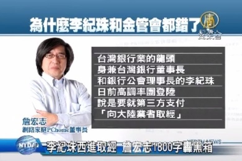 銀行公會理事長李紀珠日前帶領業界訪問大陸電商,拜訪人民銀行、銀監會,說是要了解大陸互聯網跨入金融的實際運作,但這樣的舉動,讓網路家庭董事長詹宏志看不下去,不僅缺席兩岸企業峰會,更以1800字聲明稿砲轟李紀珠,說這樣的做法是「黑相作業」、「捨近求遠」。 //asset2.ntdtv.com.tw/public/uploads/video/2014/12/17/20141217-31483558.mp4 財經焦點|李紀珠|詹宏智|第三方支付|銀行|公聽會|最新消息2014-12-16 22:44:31