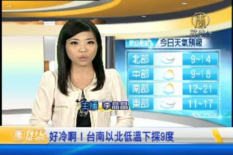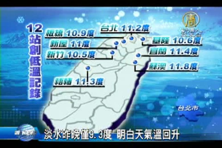 入冬以來首波寒流報到,全台冷颼颼,淡水昨天晚間8點創下平地最低溫紀錄,只有9.3度,今天清晨也只有10度低溫,另外,全台12個測站都測到打破低溫紀錄。氣象局持續發布低溫特報,要到明天白天溫度才會稍微回升。 //asset2.ntdtv.com.tw/public/uploads/video/2014/12/18/20141218-31537205.mp4 台灣要聞|寒流|冷氣團|氣象局|溫度2014-12-17 21:47:38