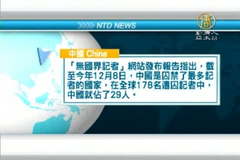 「無國界記者組織」發表年度報告,指出過去一年來,全球共有66名記者被殺害,119人被綁架。而中國是世界上關押記者最多的國家。 //asset2.ntdtv.com.tw/public/uploads/video/2014/12/18/20141218-31537186.mp4 國際聚焦|無國界記者組織|巴黎|記者遇害|中國最多2014-12-17 21:28:18
