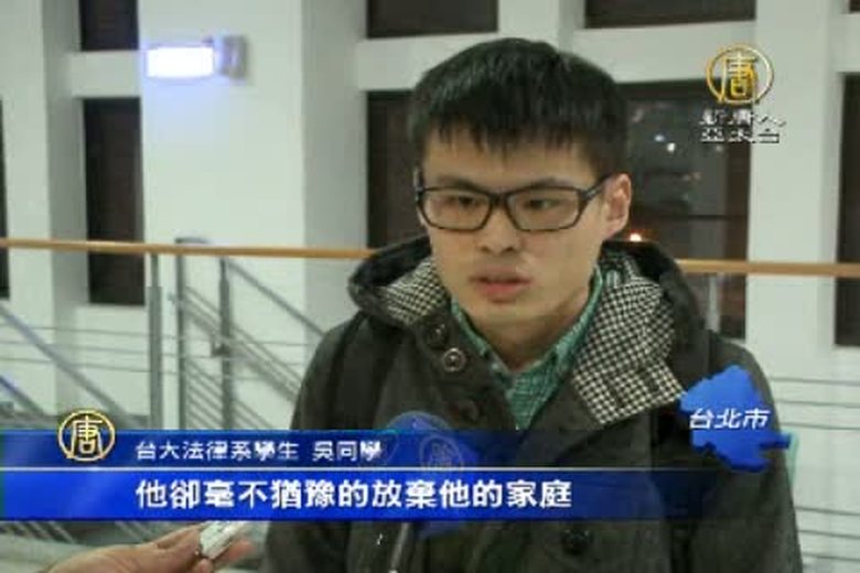 由新唐人電視台製作的紀錄片《超越恐懼:高智晟的故事》,16日晚間在台大法律學院播映,雖然天氣寒冷,還是吸引不少師生到場觀看,而高智晟律師的勇氣,也深深撼動了台大師生的心。 //asset2.ntdtv.com.tw/public/uploads/video/2014/12/18/20141218-31579862.mp4 真相中國|高智晟|謝銘洋|羅秉成|台大法律2014-12-18 13:33:41
