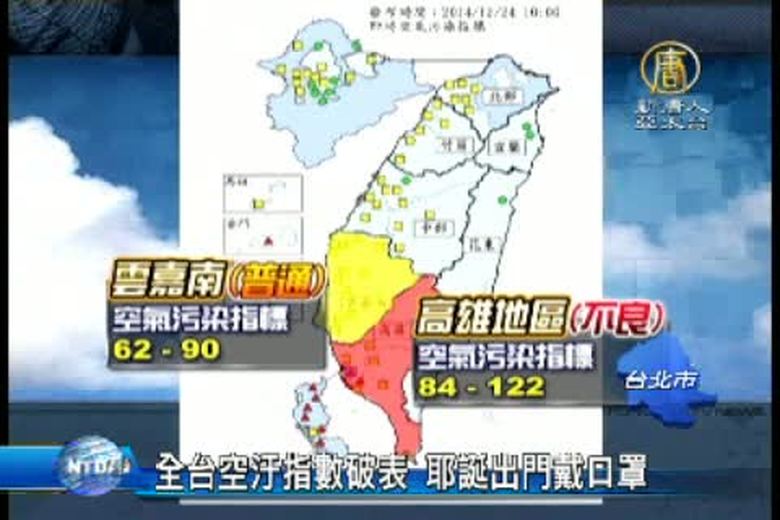今天是耶誕夜,天氣雖然不錯,但全台空氣都很糟糕,尤其是高雄地區空氣污染指標一度高達130,比正常值高出兩倍,嚴重影響人體健康,提醒民眾出門要記得戴口罩。 //asset3.ntdtv.com.tw/public/uploads/video/2014/12/25/20141225-31841697.mp4 天氣預報|空氣污染|環保署2014-12-24 21:40:29