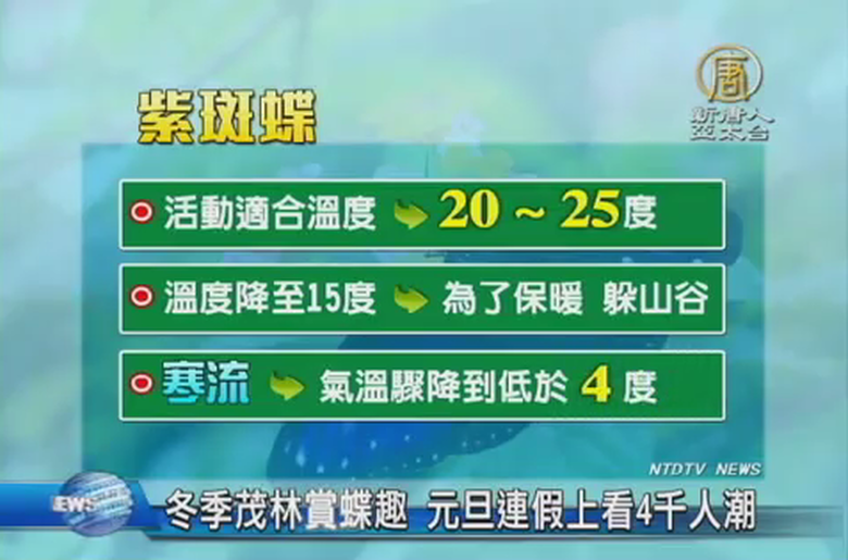 元旦連續假期,觀眾朋友想好要到哪裡遊玩了呢?每年秋冬到茂林國家風景區,是欣賞紫斑蝶最佳時機,雖然天氣寒冷,仍吸引不少民眾前往,每天平均至少500到1000人前往賞蝶,茂管處預計元旦連假上看4千人潮。 //asset2.ntdtv.com.tw/public/uploads/video/2015/01/01/20150101-32149857.mp4 觀光旅遊|紫斑蝶|茂林|許正雄|高雄2014-12-31 21:56:31