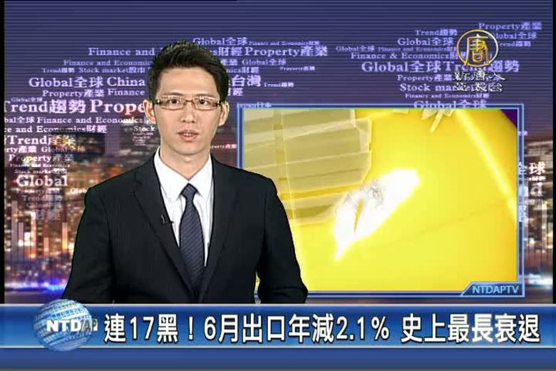 財政部今天公布6月出口228.9億美元,減幅比5月縮小,不過出口已經連續17個月衰退,創下史上最長衰退紀錄。另外,財政部說,半導體生產設備進口連4季擴增,電子零組件第三季仍有轉正機會。 //asset3.ntdtv.com.tw/public/uploads/assets/2016/07/08/2016-07-08-577f9afab0793.mp4 出口|財政部|17黑2016-07-08 20:20:09