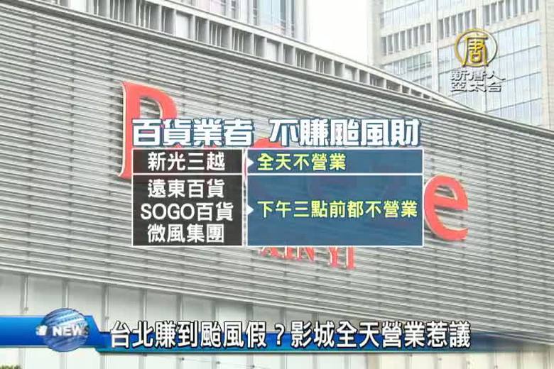 台北地區今天風雨不大,卻放颱風假,柯文哲表示,這是根據氣象局提供的資料,遵循sop流程,而這次不同以往,許多百貨、影城顧及員工安全,選擇停止營業,但也有影城業者全天營業,引發網友批評。 //asset3.ntdtv.com.tw/public/uploads/assets/2016/07/08/2016-07-08-577f9d67684b0.mp4 尼伯特颱風|颱風假|颱風財|百貨業者|影城2016-07-08 20:28:45