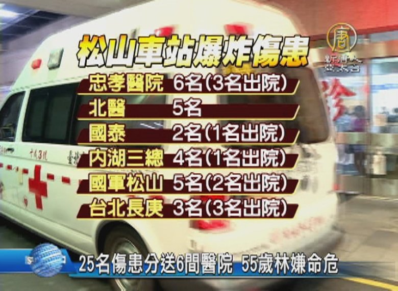 台鐵車廂爆炸,瞬間的高溫、濃煙,造成25名乘客受傷,分別被送往6間醫院,年紀最小的傷者今年才5歲。傷勢大多集中在頭部和四肢,目前,55歲的林姓嫌犯人在加護病房,有生命危險。 //asset3.ntdtv.com.tw/public/uploads/assets/2016/07/08/2016-07-08-577f98ac0c462.mp4 松山車站爆炸|台鐵車廂|燒燙|加護病房|颱風夜|柯文哲2016-07-08 20:08:38