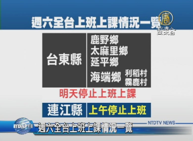 中颱尼伯特中心已經進入臺灣海峽,來關心明天各地的上班上課的情況,根據人事行政總處網站顯示,明天除了澎湖縣、金門縣還沒公布,台東縣的鹿野鄉、太麻里鄉、延平鄉、海端鄉的利稻村與霧鹿村,明天停止上班及上課,與連江縣上午停止上班外,其他各地都是正常上班上課。 //asset1.ntdtv.com.tw/public/uploads/assets/2016/07/08/2016-07-08-577fa7b97d27c.mp4 尼伯特颱風|停班停課2016-07-08 21:16:47