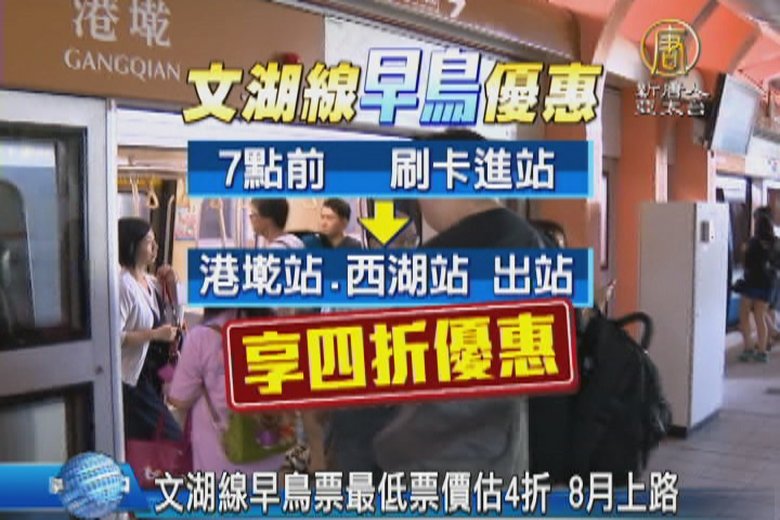 為解決內湖交通壅塞問題,台北市府規劃文湖線捷運推出早鳥票票。最新傳出,只要7點前搭車,搭到港墘站或西湖站,就能享有票價4折優惠。透過差別費率,來分散搭車人潮。雖然交通局還沒鬆口細節,但優惠措施預計8月就要上路,未來還不排除擴大到其他路線。 //asset2.ntdtv.com.tw/public/uploads/assets/2016/07/13/2016-07-13-57863f7c10382.mp4 文湖線|早鳥票|捷運|北捷2016-07-13 21:16:16