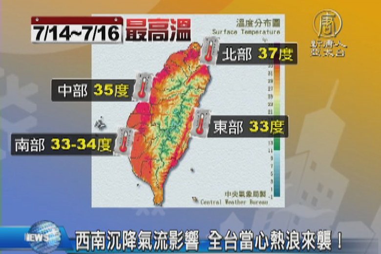 今年高溫屢創記錄,光是台北市,6月份就有8天高溫達37度以上,打破有史以來 高溫天數記錄,而未來幾天,全台受到西南風影響,還會再飆高溫,預報中心主任鄭明典一早就在臉書警告,有機會連3天高溫達37度,接近熱浪的定義,要大家提高警覺 。 //asset3.ntdtv.com.tw/public/uploads/assets/2016/07/14/2016-07-14-578785eb704ba.mp4 氣象|高溫|創記錄|台北|西南風|鄭明典|熱浪2016-07-14 20:26:17