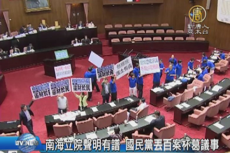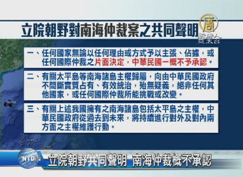而針對南海仲裁案結果,立法院發表朝野黨團的共同聲明,嚴厲聲明仲裁的片面決定,中華民國一概不予承認,除此之外,國民黨團也要求總統到立法院報告,但趕在會期最後一天才提出,民進黨就批評國民黨,根本是要拖延不當黨產處理條例。 //asset2.ntdtv.com.tw/public/uploads/assets/2016/07/15/2016-07-15-5788d5088287f.mp4 南海仲裁|經濟海域|總統報告|立法院|共同聲明2016-07-15 20:16:32