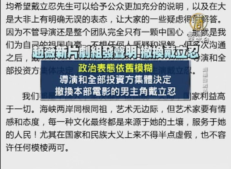 由趙薇執導的新片,找來台灣演員戴立忍參與演出,但卻遭中國網友影射,是台獨份子,儘管戴立忍曾發文澄清,但劇組今天仍發出聲明表示,決定撤換戴立忍角色。 //asset2.ntdtv.com.tw/public/uploads/assets/2016/07/15/2016-07-15-5788d8388a19f.mp4 戴立忍|趙薇|換角2016-07-15 20:30:17