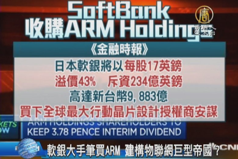 日本 SoftBank 確定以 234 億英鎊(約台幣 9,897 億元)的價格,收購英國 IC 智財授權廠商安謀(ARM),成為歐洲史上最大的科技業併購案。 //asset1.ntdtv.com.tw/public/uploads/assets/2016/07/18/2016-07-18-578ccf16bc533.mp4 ARM|軟銀|孫正義|IOT|物聯網2016-07-18 20:40:12