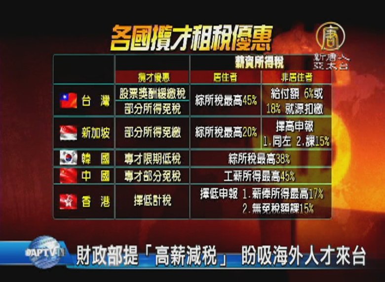 人才外流嚴重,要吸引國外優質人才來台灣工作,財政部打算提出「留才、攬才」計畫,初步擬定高薪族減稅,讓高薪族薪資所得和其他所得分開計稅,其中薪資所得部份,採優惠稅率,約在25%~30%之間,希望吸引國外人才到台灣。 //asset1.ntdtv.com.tw/public/uploads/assets/2016/07/25/2016-07-25-579602841717a.mp4 財政部|高薪減稅|人才|薪資2016-07-25 20:12:24