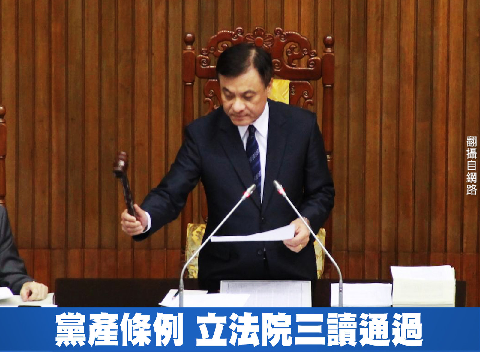 最新消息,立法院在剛剛三讀通過黨產條例,經過將近12個小時、60多次表決,法案順利闖關。晚間8點半左右,立法院長蘇嘉全敲議事槌,宣布黨產條例三讀通過,法案在民進黨立委人數優勢表決下,順利通過二、三讀,民進黨立委群情振奮,高喊口號,並且開心的在發言台前合照慶祝。 //asset1.ntdtv.com.tw/public/uploads/assets/2016/07/25/2016-07-25-57960a2432ec9.mp4 黨產條例|國民黨|黨產|立法院2016-07-25 20:44:02