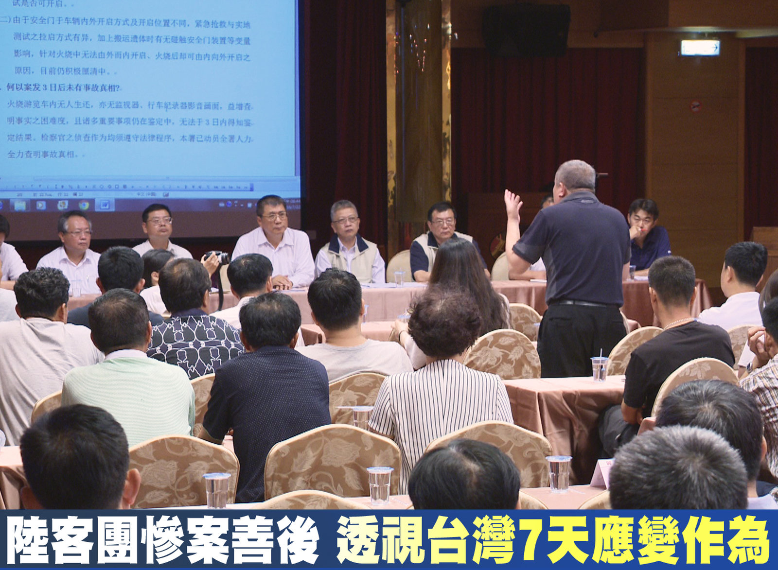 上星期二,遼寧陸客團火燒車慘案,造成26人不幸罹難;之後,政府對台灣內部提出遊覽車、觀光品質改革,而對於心痛的罹難者家屬,台灣方也投入數百人力,第一時間,快速反應,主張透明溝通、將心比心。帶您透視,七天來,政府的應變與作為。 //asset3.ntdtv.com.tw/public/uploads/assets/2016/07/25/2016-07-25-579614fe14599.mp4 陸客團火燒車|陸客團|海旅|台旅2016-07-25 21:32:59