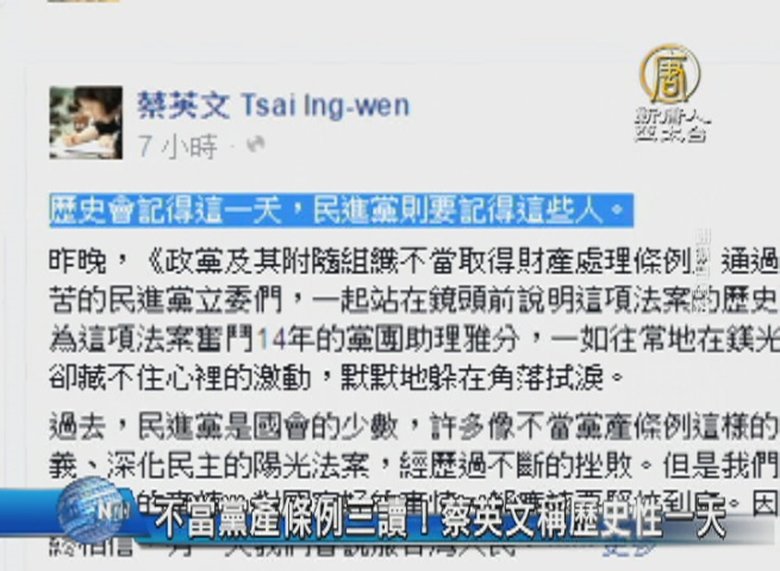 不當黨產條例三讀!蔡英文稱歷史性一天