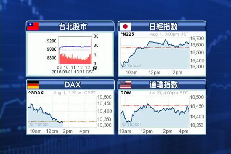 來關心台股。隨著美國公布第2季GDP大幅不如預期,市場預料美元短期可能走弱,8月一開始,資金再度強勁回流,早盤除了台股加權指數上漲80點左右,權值股台積電、大立光、鴻海帶領台股展開強勁反彈,收復9000點大關,終場9080.71點,成交量約775.4億元。台北匯市同樣可見拋匯力道轉強,新台幣飆升,最高來到31.75元,再創去年8月中旬以來新高價位。 //asset2.ntdtv.com.tw/public/uploads/assets/2016/08/01/2016-08-01-579f3deaa7b5a.mp4 2016-08-01 20:16:14