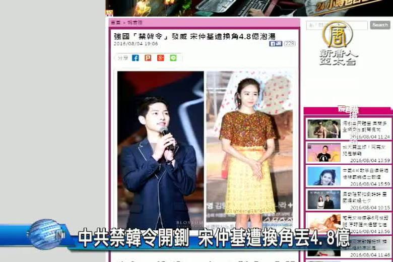 不滿南韓佈署反飛彈系統,中共廣電局傳出「禁韓令」,現在,南韓藝人宋仲基,也傳出遭到換角。陸媒《全明星探》報導,《新蜀山劍俠傳》製片方透露,本來男主角的人選是宋仲基與金秀賢,但因宋仲基開價約台幣4.8億元片酬,讓劇組遲遲未簽約,加上「禁韓令」影響,劇組決定棄用有「全民老公」稱號的宋仲基,另外,韓星秀智和金宇彬,原本後天要在北京舉辦粉絲見面會。但昨天臨時宣布取消。目前,已有劇組接到廣電總局口頭通知,要求拍戲不要再請韓星。 //asset3.ntdtv.com.tw/public/uploads/assets/2016/08/04/2016-08-04-57a3410c34892.mp4 禁韓令|薩德飛彈|宋仲基|金秀賢|金宇彬|秀智2016-08-04 21:20:19