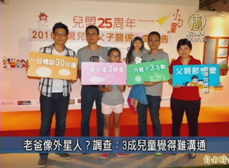 兒福聯盟今天公布2016台灣兒少父子關係調查報告,結果顯示與孩子照顧的親職項目中,爸爸參與都很少,甚至3成12覺得老爸難溝通。 //asset2.ntdtv.com.tw/public/uploads/assets/2016/08/07/2016-08-07-57a72e64802aa.mp4 2016-08-07 21:17:49