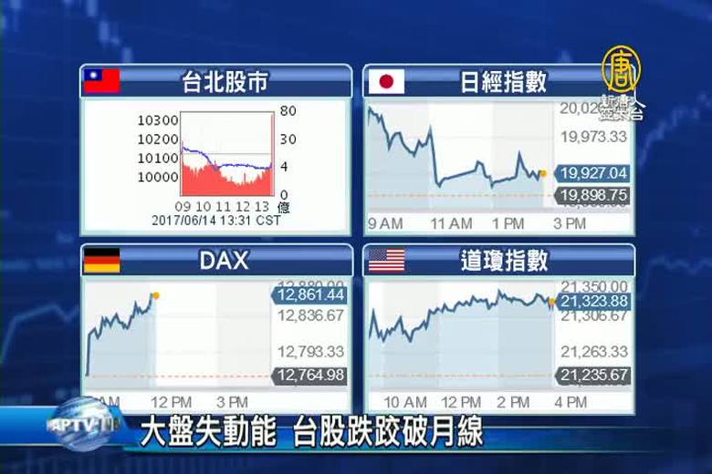 來關心今天金融股匯市行情,儘管美股週二創高,科技股止穩,台股今天早盤,蘋概股雖然陸續回穩,但大盤整體仍維持量縮觀望的態勢,惟盤中受到大立光賣壓拖累,大盤開高走低,震盪翻黑,跌破 10100 點,失守月線。終場下跌55點、收在10072點、成交值新台幣969.52億元。 另外,今天新台幣欲振乏力,終場以30.230元兌1美元作收,貶值0.3分,匯價連7貶並續創超過1個月新低。 //asset2.ntdtv.com.tw/public/uploads/assets/2017/06/14/2017-06-14-59412840866af.mp4 台股|月線失守|新台幣匯率|美元2017-06-14 20:09:36