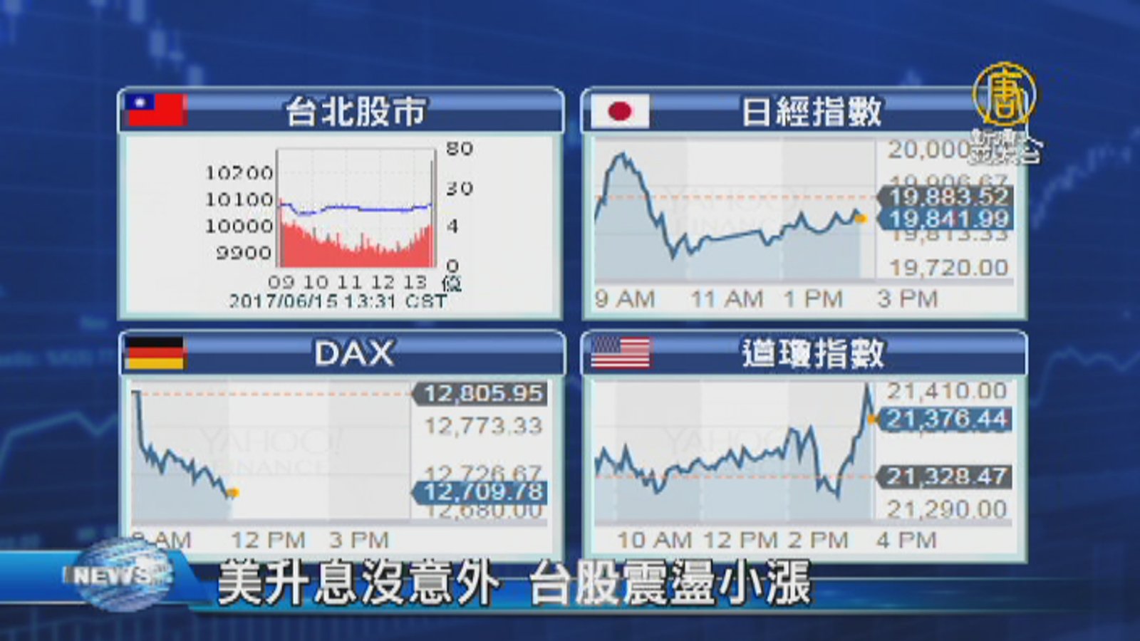來關心金融股市行情,美國聯準會宣布,決定升息1碼,如市場預期,加上美國科技股表現疲弱,使得台股早盤呈現平盤附近震盪格局,今天台北股市以電子類股,為多頭反攻的指標,台股今天終場上漲15點,收在10088點,成交值新台幣758.29億元。而新台幣匯率今天呈現開高走低格局,終場貶值1.7分,以30.247元兌1美元作收,匯價連8貶並續創超過1個月新低。 //asset2.ntdtv.com.tw/public/uploads/assets/2017/06/15/2017-06-15-594278d01dd0c.mp4 FED|升息|台股|新台幣匯率2017-06-15 20:07:03