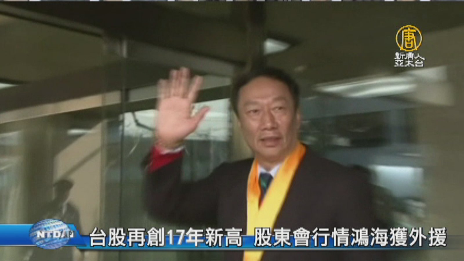美國在聯準會樂觀談話的氣氛下,科技股大漲,華爾街股市三大指數均全面上揚,也帶動台股亮眼表現,台股今天在台積電等蘋果概念股的支撐下,收盤大漲73.86點,以10324.46點作收,續創17年來新高。尤其22日就將召開股東會的鴻海,外資力挺下,今天盤中漲幅超過5%,一度觸及115元,主因包括看好鴻海轉型步伐,加上日本夏普經營繳出亮眼成績單,都是主要關鍵因素,外資連續4個交易日,買超鴻海接近四萬張股票,如今市值突破1.89兆元。 //asset2.ntdtv.com.tw/public/uploads/assets/2017/06/20/2017-06-20-5949110688a34.mp4 鴻海|郭台銘|外資|台股|加權指數|蘋概股2017-06-20 20:09:55