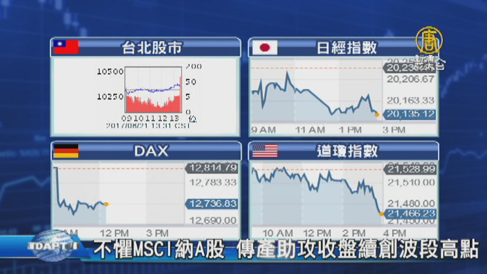 新聞首先,帶您關心,中國A股闖關成功,納入MSCI新興市場指數,亞洲股市今天是漲跌互見,包括韓國跟日本股市都是呈現下跌,而台股的部分,在外資力挺下,今天則是沒有出現重大波動,至於中長期效應,有分析師認為,長期將對國際資金,造成排擠效應。我們今天的,頭條焦點。 //asset2.ntdtv.com.tw/public/uploads/assets/2017/06/22/2017-06-22-594b5ec3c01bc.mp4 MSCI|A股|台股|新興市場指數|加權指數2017-06-22 22:19:19