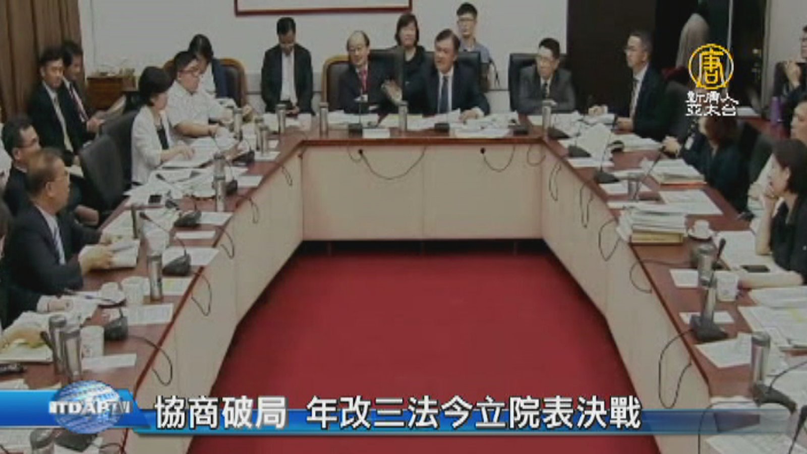 立法院協商年金改革修法破裂,今天(22日)進入逐條表決戰,國民黨祭出每人登記發言3分鐘,來阻擋審查,整個上午才表決兩條法案,引發綠營不滿,總統蔡英文中午和立委便當會時,也再次強調不要杯葛拖延,希望改革成功,至於外界關注的公務員年金改革樓地板,下午以民進黨團版本通過,最低保障金額為新台幣3萬2160元。 //asset1.ntdtv.com.tw/public/uploads/assets/2017/06/22/2017-06-22-594bb58e6c353.mp4 年金改革|修法|逐條表決|立法院|吳敦義2017-06-22 20:14:50
